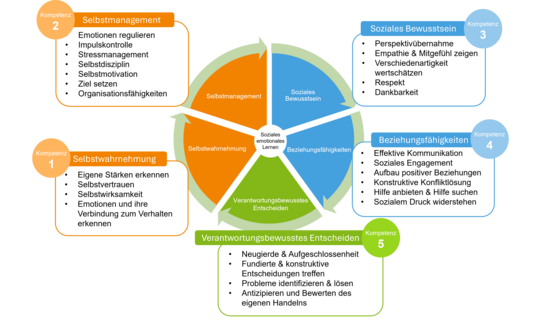 MindOut ist ein wissenschaftlich fundiertes und kompetenzbasiertes Programm speziell für weiterführende Schulen, das in Irland konzipiert wurde und dort bereits seit 2018 mit großem Erfolg an Schulen umgesetzt wird. Basierend auf den Erkenntnissen des Collaborative for academic, social and emotional learning (CASEL) (Weißberg et al., 2015) (https://casel.org/fundamentals-of-sel/what-is-the-casel-framework/) sollen die fünf Schlüsselkompetenzen des sozialen und emotionalen Lernens (SEL) als zentrale Lernkompetenzen in den Unterricht integriert werden (s. Abbildung 1).: